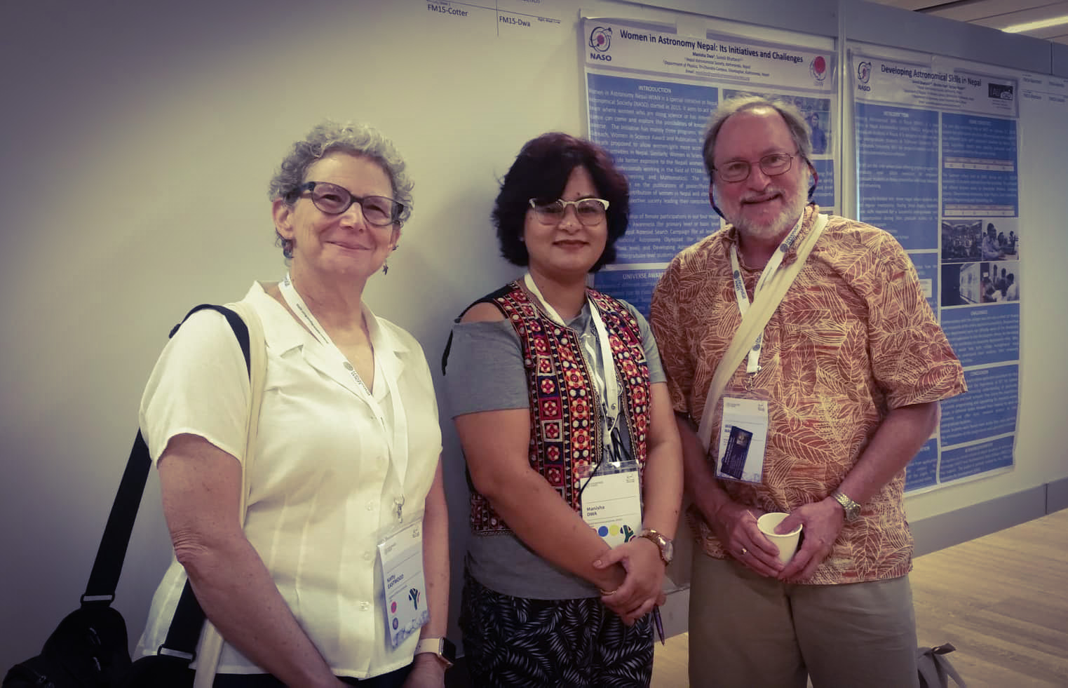 Photo: Mr. Suresh Bhattarai, Chairman at Ms. Manisha Dwa, project coordinator at NASO with Prof. Dr. Prof. Dr. Ewine F. van Dishoeck during at IAU GA2018.
